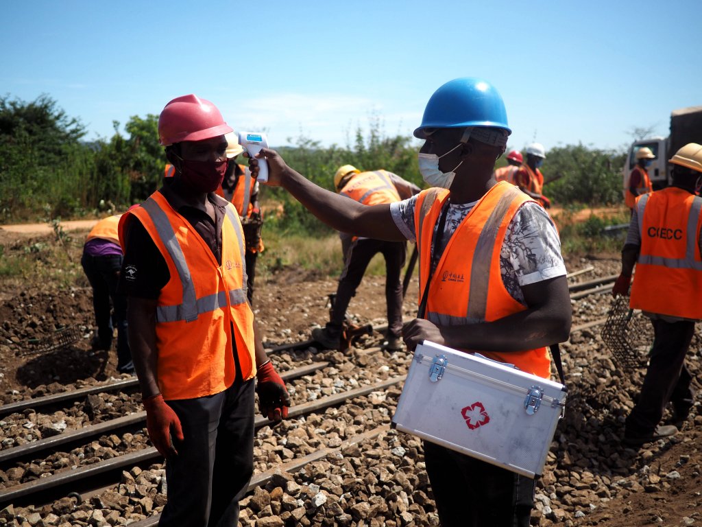 A community health worker takes temperature for his colleague at a site of Tanzania's Central Railway Line rehabilitation project undertaken by China Civil Engineering Construction Corporation in Tanzania on May 30, 2020. Source: https://www.sohu.com/a/413000663_267106