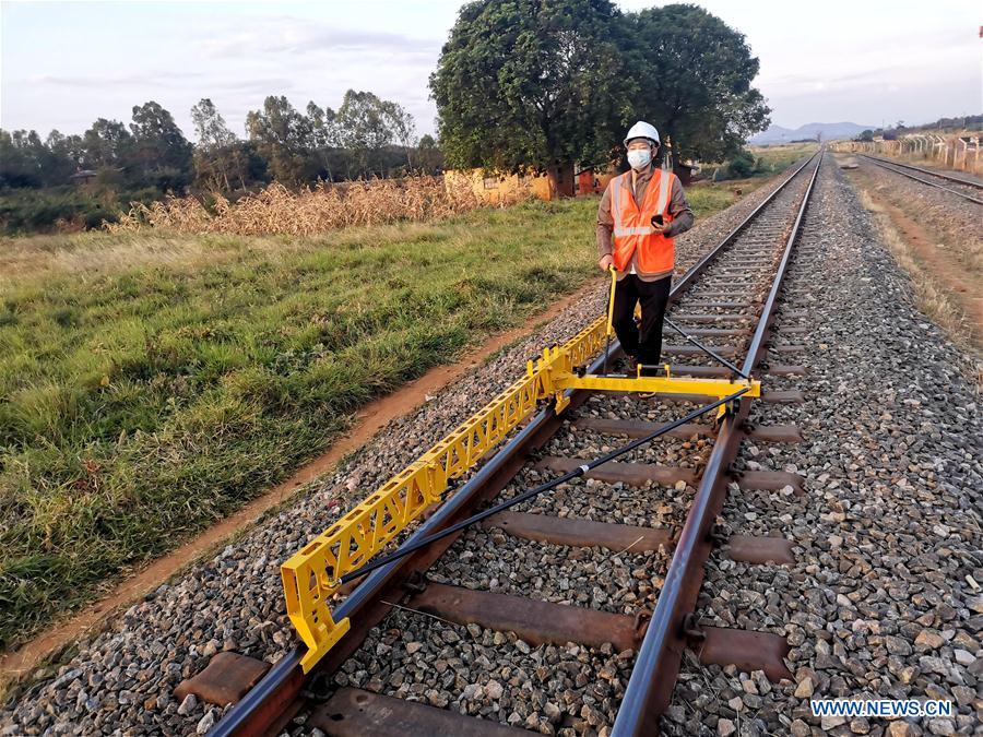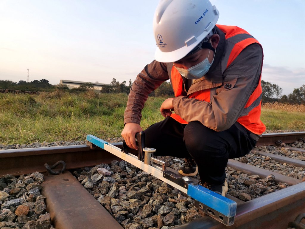 Assistant engineer Zhang Guikai measures tracks at a site of Tanzania's Central Railway Line rehabilitation project undertaken by China Civil Engineering Construction Corporation in Tanzania on Aug. 5, 2020. Source: http://www.xinhuanet.com/english/africa/2020-08/14/c_139290023.htm