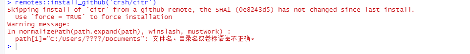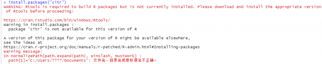 The only issue that you must have used some characters (possibly your name in Chinese) which are not supported in the path "C:/Users/???/Documents". R does not well support multi-byte characters in the paths. Please work in a directory with simple letters as the name, such as "d;/R/env222".