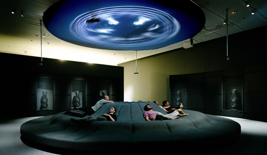 Created by sound expert Julian Treasure, the piece is a decorative table with wireless headphones and a microphone. The audience can plug their headphones into sockets on the table and thus immerse themselves in a surround sound environment emanating from the table. The table also records the sound of the audience's speech and translates it into visuals, adding to the sense of interactivity and engagement.